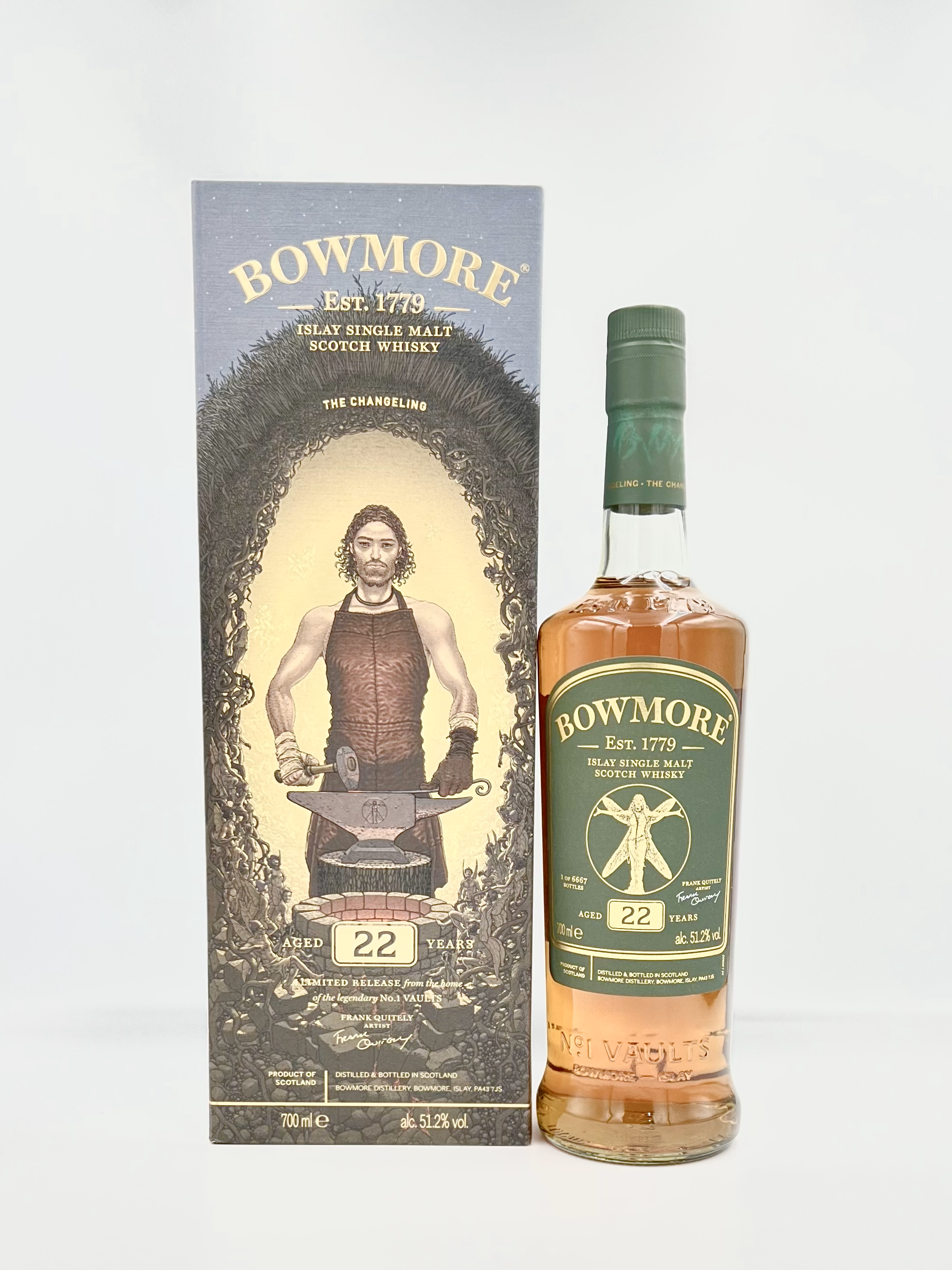 The Changeling is a unique and captivating release from the Bowmore distillery, masterfully crafted by artist Frank Quitely and Bowmore's master blender Ron Welsh. This whisky is part of the Frank Quitely collection, a series that seeks to weave the rich myths and legends of Islay, the home of Bowmore, into its expressions.